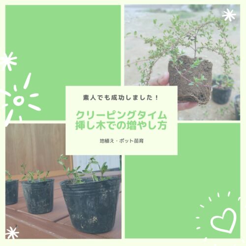 『植栽コーナーの緑を増やしたい』 そんな思いから手始めにグランドカバーのクリーピングタイムの増殖に着手しました。 ちなみにクリーピングタイムとはこんなのです。写真からも分かる通り岩の隙間、砂利の上でも根を張ることのできる植物。 もちろん土でも…